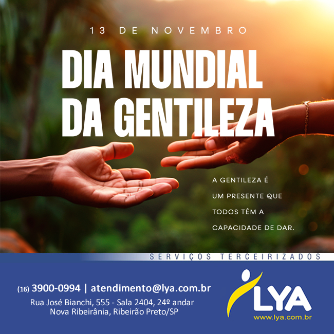 Em nome da Lya Serviços Especializados, celebramos o Dia Mundial da Gentileza com profundo apreço por cada membro da nossa equipe e cada cliente que confia em nossos serviços. Acreditamos que a gentileza é a essência de uma colaboração bem-sucedida. Hoje, renovamos nosso compromisso de fornecer não apenas soluções terceirizadas excepcionais, mas também um atendimento gentil e dedicado. Que cada interação seja permeada por respeito e cordialidade. Agradecemos por fazer parte deste caminho de gentileza conosco. Feliz Dia Mundial da Gentileza!